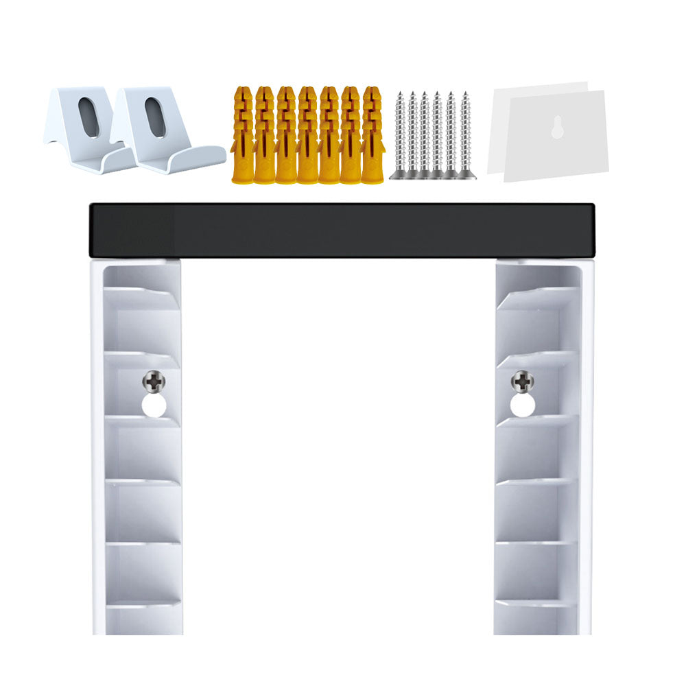The package includes all necessary accessories such as wall anchors, screws, and adhesive pads for easy installation.