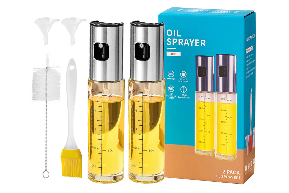 - Includes 100ml oil sprayers, perfect for olive oil, sunflower oil, vinegar, and more. Ideal for even application in frying, baking, grilling, and salad dressing.