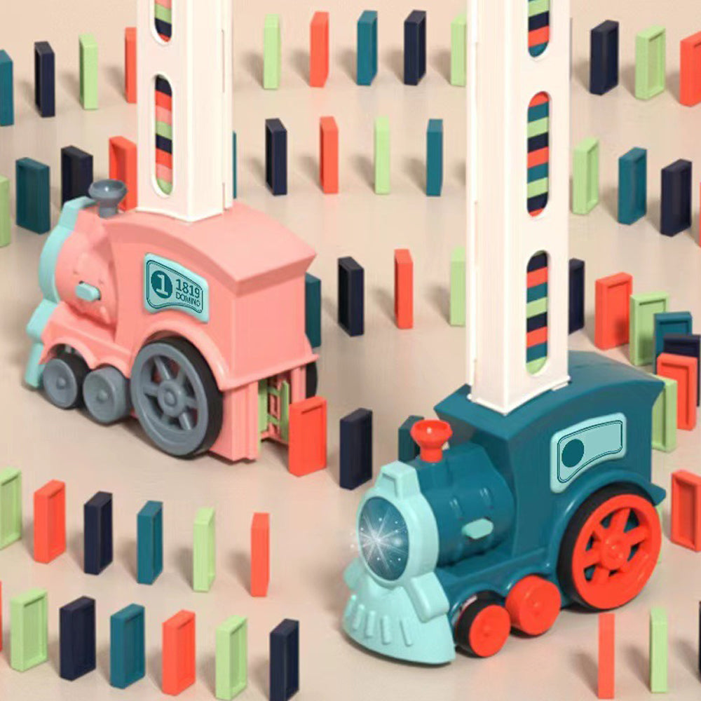 This domino train toy automatically places domino blocks as it moves, making it easy and time-saving.