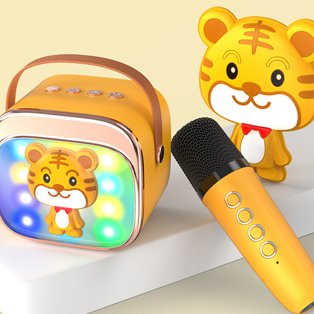 - Portable Bluetooth karaoke speaker with LED lights and dual microphones, perfect for music, singing, camping, or parties.