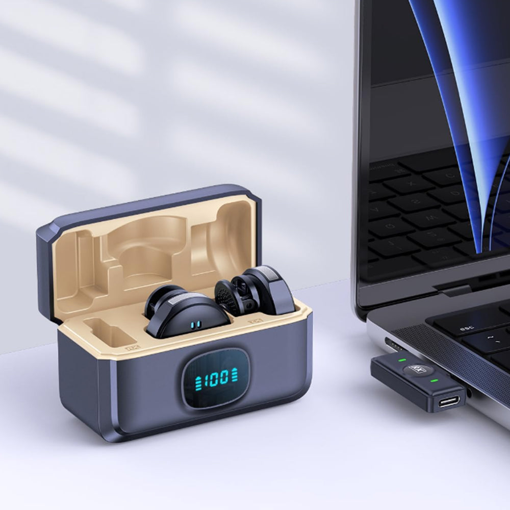 The charging case features a battery indicator for easy monitoring of power levels.
