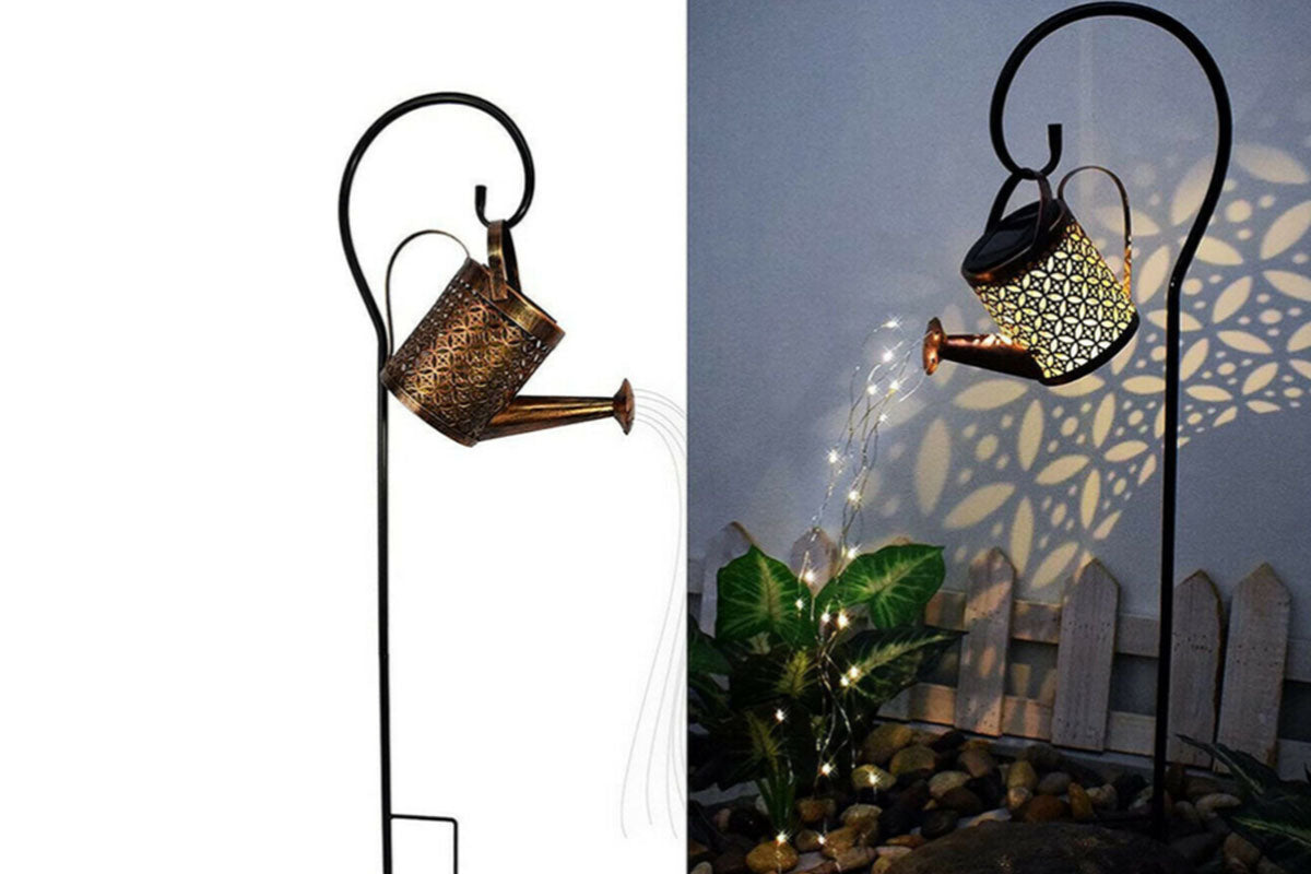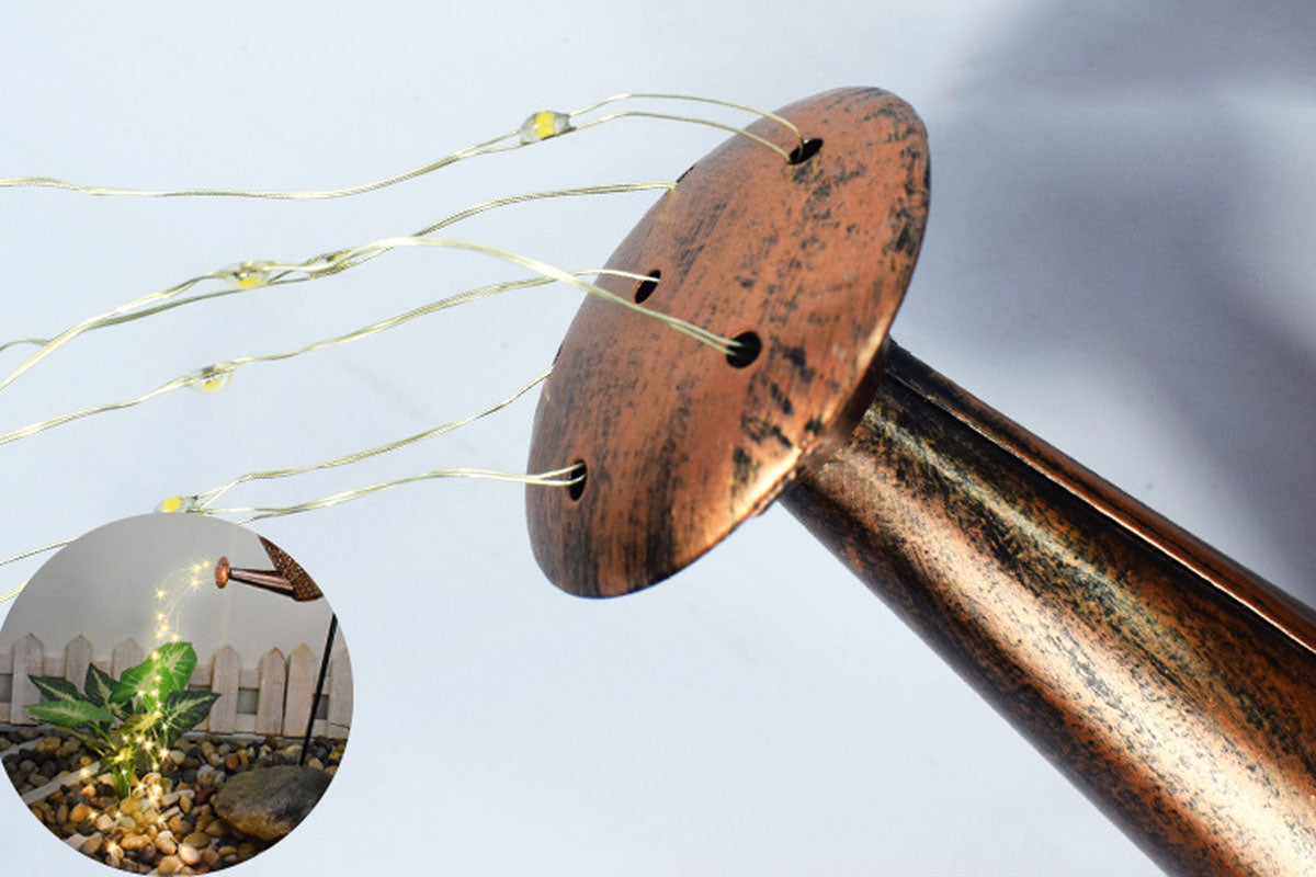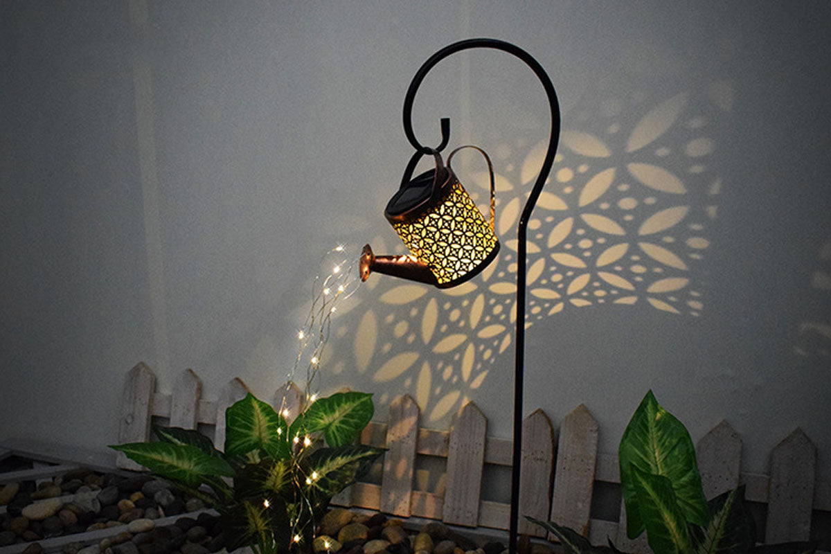 Small Garden Decorative Light: Solar watering can lights (with shepherd hook) comes with strands of LED flashing string lights, can be easily bent and shaped into any shape you like, perfect for DIY. These lamp beads will light up at night. The built-in high-brightness LED bulb amplifies the hollow pattern and projects it onto the ground and surroundings, creating a romantic atmosphere.