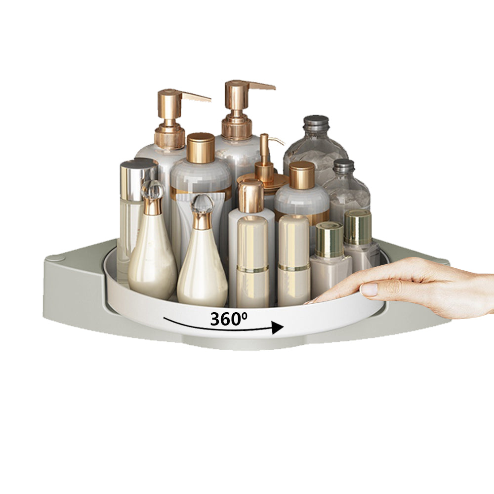 360 degrees rotating, just gently rotate it to put hard-to-reach bathroom toiletries in the back to your fingertips without knocking over items or stretching your arms.